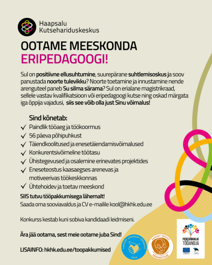- tööd kaasaegses, turvalises ja innovaatilises keskkonnas ning arenevas õpikogukonnas asukohaga Haapsalu äärelinnas;